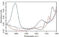 Figure 2: Spectra of all samples in the 1500 cm-1 to 1000 cm-1 region. Patanol® (red), SunMark® (black), and Visine® (blue).