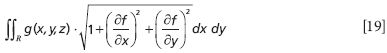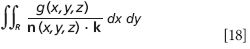 where the denominator contains a dot product and the integration is over the x and y limits of the region R in the (x,y) plane of Figure 19. The dot product in the denominator is actually fairly easy to generalize. When that happens, the surface integral becomes