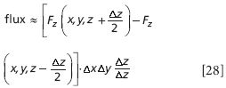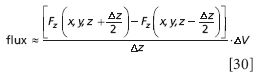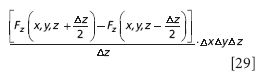 As the cube shrinks, Δz approaches zero. In the limit of infinitesimal change in z, the first term in the product above is simply the definition of the derivative of Fz with respect to z! Of course, it's a partial derivative, because F depends on all three variables, but we can write the flux more simply as