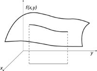 As with differentiation, integration can also be extended to functions of more than one variable. The issue to understand is that when considering functions, the space you need to use has one more dimension than variables because the function needs to be plotted in its own dimension. Thus, a plot of a one-variable function requires two dimensions, one to represent the variable and one to represent the value of the function. Figures 9 and 10 in the previous installment (1) are therefore two-dimensional plots. A two-variable function needs to be plotted or visualized in three dimensions, like Figures 11 or 12 in the previous column. Looking at the two-variable function in Figure 17, we see a line across the function's values, with its projection in the (x,y) plane. The line on the surface is parallel to the y axis, so it is showing the trend of the function only as the variable x changes. If we were to integrate this multivariable function with respect only to x (in this case), we would be evaluating the integral only along this line, called a line integral. One interpretation of this integral would be that it is simply the part of the volume under the overall surface that is beneath the given line; that is, it is the area under the line.