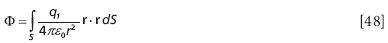 Let us consider a spherical surface around our original charge that has some constant radius r. The normal unit vector n is simply r, the radius unit vector, since the radius unit vector is perpendicular to the spherical surface at any of its points (Figure 25). Because we know the definition of E from Coulomb's law, we can substitute into the expression for electric flux