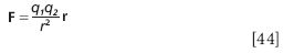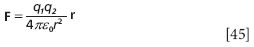 If two electric charges were placed in space near each other, as is shown in Figure 24, there would be a force of attraction between the two charges. The charge on the left would exert a force on the charge on the right, and vice versa. That experimental fact is modeled mathematically by Coulomb's law, in which a vector form is