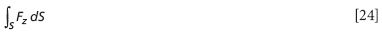 The mathematical tactic for evaluating the surface integral is to project the functional value into the perpendicular plane, accounting for the variation of the function's angle with respect to the projected plane. The proper variation is the cosine function, which gives you a relative contribution of 1 if the function and the plane are parallel (for example, cos 0° = 1) and a relative contribution of 0 if the function and the plane are perpendicular (for example, cos 90° = 0). This automatically makes us think of a dot product. If the space S is being projected into the (x,y) plane, then the dot product will involve the unit vector in the z direction, or k. (If the space is projected into other planes, other unit vectors are involved, but the concept is the same.) If n(x,y,z) is the unit vector that defines the line perpendicular to the plane marked out by g(x,y,z) (called the normal vector), then the value of the surface integral is given by