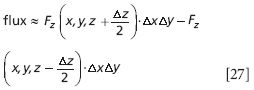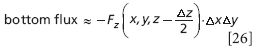 The flux of F on the bottom side is exactly the same except for two small changes. First, the normal vector is now –k, so there is a negative sign on the expression. Second, the bottom surface is lower than the center point, so the function is evaluated at z – Δz/2. Thus, we have