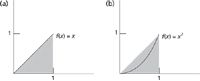 It is a bit messier if the function is more complicated. But, as first demonstrated by Reimann in the 1850s, the area can be calculated geometrically for any function in one variable (easy to visualize, but in theory this can be extended to any number of dimensions) by using rectangles of progressively narrower widths, until the area becomes a limiting value as the number of rectangles goes to infinity and the width of each rectangle gets infinitely narrow — one reason a good calculus course begins with a study of infinite sums and limits! But I digress. For the function in Figure 16b, which is f(x) = x2 , the area under the curve, now poorly approximated by the shaded triangle, is calculated exactly with an integral: