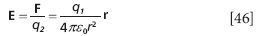 where in the second expression we have substituted the expression for F. Note that E is a vector field (as indicated by the bold-faced letter) and is dependent on the distance from the original charge. E also has a unit vector that is defined as the line between the two charges involved, but in this case the second charge has yet to be positioned, so in general E can be thought of as a spherical field about the charge q1. The unit for an electric field is newton per coulomb, or N/C.