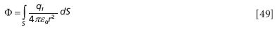 If the charge q1 is constant, 4 is constant, π is constant, the radius r is constant, and the permittivity of free space is constant, these can all be removed from the integral to get