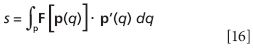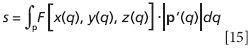 The integration is over the path p, which needs to be determined by the physical nature of the system of interest. Note that in the integrand, the two functions F and |p's| are multiplying together.