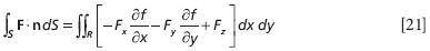 For a vector function F = Fxi + Fyj + Fzk and a surface given by the expression f(x,y) = z, this surface integral is