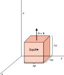 Consider an ideal cubic surface with the sides parallel to the axes, as shown in Figure 21, that surrounds the point (x,y,z). This cube represents our function F and we want to determine the flux of F. Ideally, the flux at any point can be determined by shrinking the cube until it gets to a single point. We will start by determining the flux for a finite-sized side, then take the limit of the flux as the size of the side goes to zero. If we look at the top surface, which is parallel to the (x,y) plane, it should be obvious that the normal vector is the same as the k vector. For this surface by itself, the flux is then