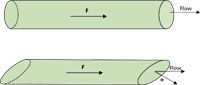 Figure 20: Flux is another word for amount of flow. (a) In a tube that is cut straight, the flux can be determined from simple geometry. (b) In a tube cut at an angle, some vector mathematics is needed to determine flux.