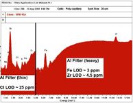 In Figure 1, analysis of glass using the 30 μm poly-capillary and primary beam filters for comparative purposes and compositional analysis is shown. Analysis of Cl down to an LOD ~ 25 ppm was achieved using a filter to remove the overlapping Rh(L) tube scatter line.