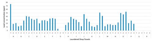 Reusable shop towels are a staple item in the automotive service industry and other machinery-focused manufacturing and repair businesses. Shop towels (durable cloth wipers) are commonly used to spread cleaners and absorb or remove oil, grease, and dirt. They are routinely used for a wide variety of applications including wiping engine or mechanical parts and for cleaning work surfaces. These types of industries commonly use a laundry service to clean their soiled shop towels. The laundering process can take shop towels from several different locations and industries and combine them to wash the towels in bulk. The towels are then randomly redistributed back to their customers. If all the dirt and grime is not removed during the cleaning process, the residual contaminants from one industry can then end up on a laundered shop towel used by workers in a different industry. In addition to the random redistribution of the towels, there is also the possibility that as the towels are washed a portion of the dirt and grime is released and redeposited, cross-contaminating the laundered towels. In either case, commingling the shop towels from several different locations and industries in the laundering process may result in hazardous heavy metals in one industry coming in contact with workers in another industry.