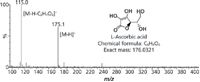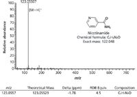 Product A tablet was confirmed as counterfeit by Raman spectroscopy and was suspected to contain ascorbic acid based on comparison of the Raman spectrum to spectra in the library. A portion of the counterfeit tablet was extracted with 50:50 acetonitrile–water and sonicated for 20 min. The extracted liquid was filtered and diluted (1:15) for LC–UV-MS analysis. Figure 2 shows the LC–UV chromatogram obtained from the preliminary low-resolution LC–MS experiment. Component 1 was ionized using negative-ion ESI and was confirmed to be ascorbic acid based on the determined molecular weight of 176 Da as shown in Figure 3. Detection of ascorbic acid was consistent with the initial Raman analysis. The molecular weight of component 2 was assigned as 122 Da based on the low-resolution mass spectrum. To obtain the molecular formula of component 2, the sample was analyzed on a high-resolution instrument using positive-ion ESI, as shown in Figure 4. For component 2, evaluation of possible elemental compositions resulted in a single formula (C6H6N2O). Because only a single formula possibility was obtained, the formula was entered into an internet search engine to obtain a list of matching structures. The internet search on C6H6N2O returned nicotinamide as a possible structure. Next, 1H NMR data of the extract were collected to check for organic compounds that may not have been visible in the LC–UV-MS analysis and to further confirm the structure proposals for component 1 and component 2. Component 1 and component 2 were confirmed by 1H NMR to be ascorbic acid and nicotinamide. No additional components were detected by NMR. The 1H NMR data were also used to determine the mole ratio of ascorbic acid:nicotinamide as 4:1 (qNMR). An internet search confirmed the availability of commercial vitamin supplements with ascorbic acid and nicotinamide present in the same ratio.