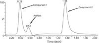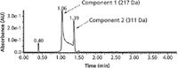 The general strategy that is used for testing counterfeit products has also been applied to the characterization of customer complaint samples. A complaint sample (product E) was received for characterization after preliminary testing by Raman and NIR spectroscopy indicated that the product contained within the bottle was not authentic. Visual examination of the packaging revealed the presence of pink residue on the threads of the dropper bottle, which indicates that at one point the bottle contained the authentic product (pink liquid), but was subsequently refilled with an unknown yellow liquid material. Two peaks, connected by a low horizontal plateau, were detected in the LC–UV chromatogram (see Figure 14). This type of peak shape is frequently indicative of an on-column interconversion or degradation (22). Molecular weights of 217 Da and 311 Da were assigned to these two observed components. The mass spectrum of the 311 Da component is shown in Figure 15. Accurate-mass data afforded molecular formula information. The compound was determined to contain sulfur, and a loss of H2SO3 was observed from in-source fragmentation. NMR analysis performed in parallel indicated the presence of a monosubstituted phenyl ring, three methyl groups, and a methylene group. The MS data coupled with the information obtained from the NMR analysis was used to elucidate the structures of the two compounds as shown in Figure 16. Based on the structures, on-column degradation could easily be rationalized. The primary component (311 Da) was identified as metamizole, a powerful analgesic and antipyretic (23) that is available over the counter (OTC) as a yellow solution. The indication for product E does not align with that of metamizole.