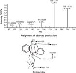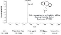 Product C was received and tested by LC–UV-MS after preliminary Raman screening confirmed its status as a counterfeit. No additional structural information could be gleaned from the Raman spectral analysis because the spectrum failed to yield a high-quality match with any of the compounds in the library. Similar to previous work, a portion of the counterfeit tablet was extracted with 50:50 acetonitrile–water and sonicated for 20 min. The extracted liquid was filtered and diluted (1:5) for LC–MS analysis. Figure 8 shows the LC–UV chromatogram at 220 nm that was obtained for the tablet extract, which indicates the presence of only one major component. The mass spectrum obtained for the major component observed in the HPLC analysis using positive-ion ESI is shown in Figure 9. The molecular weight of the compound was determined to be 277 Da. The elemental composition obtained from the accurate-mass measurement was C20H23N. This was the only possible formula returned by the software within the restricted accuracy window of 1.25 mmu. The formula was searched on the internet for possible structure matches and amitriptyline was the result. For additional confirmation of the identity of the counterfeit as amitriptyline, an accurate-mass product ion mass spectrum was collected and the product ion assignments are shown in Figure 10. All of the observed product ions are consistent with the identification of the active component of amitriptyline. As in the previous case studies, 1H NMR was used to confirm the structure of amitriptyline and ensure the absence of additional organic components. Amitriptyline is a tricyclic antidepressant that is used in the treatment of a variety of medical conditions including depressive and anxiety disorders, attention deficit disorder, hyperactivity disorder, migraines, eating disorders, insomnia, and bipolar disorder, among others (20). Though this product did contain an approved active pharmaceutical ingredient, amitriptyline, it did pose a significant risk to the patient because this compound is not an approved therapy or active against the target disease indicated for treatment with product C.
