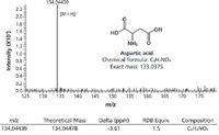 A tablet of suspected counterfeit product B was received following initial determination of counterfeit status by Raman spectroscopy. No additional structural information was obtained from the Raman analysis. A portion of the counterfeit tablet was extracted with 50:50 acetonitrile–water and sonicated for 20 min. The extracted liquid was filtered and diluted (1:10) for LC–UV-MS analysis. No significant components were detected in the LC–UV chromatogram; however, a poorly retained component was detected in both the positive- and negative-ion ESI total ion chromatograms as shown in Figure 5. The molecular weight of this component was determined to be 133 Da based on the positive- and negative-ion mass spectra (Figure 6). An accurate-mass analysis was conducted in positive-ion ESI mode and the data is shown in Figure 7. A single possibility for the molecular formula was obtained from the accurate-mass data (C4H7NO4). An internet search conducted on this molecular formula suggested the identification was aspartic acid, which was confirmed by analyzing the extraction mixture by 1H NMR. The 1H NMR data additionally confirmed the absence of other organic components.