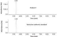 Figure 17: LCâUV chromatograms of product F and an authentic sample of tartrazine (430 nm).