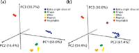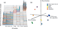 Figure 2: The TIC traces were submitted to PCA. (a) The score plots show the edible oil varieties clearly distinguished and (b) the distinction of simulated fraud mixtures (with blue outer circles) as different from the pure oils.