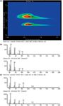 Figure 6: 1-Penten-3-one and 1-penten-3-ol appear as a single peak in the GCÃGC data. With deconvolution two distinct peak shapes are apparent and the isolated mass spectra were library matched with similarities of 824 and 861, respectively.