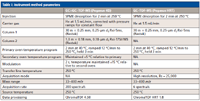 GC×GC analyses were performed with LECO's Pegasus 4D system, consisting of an Agilent 7890 GC system, modified with LECO's dual-stage quad jet thermal modulator and secondary oven and paired with LECO's Pegasus TOF-MS system. GC–high resolution (HR)-TOF-MS analyses were performed with LECO's Pegasus HRT system consisting of an Agilent 7890 GC system paired with LECO's high-resolution TOF-MS system. Method parameters are compiled in Table I.