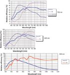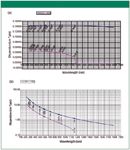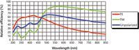 Figure 6 shows the reflectivity curve for an 1800-g/mm holographic grating that has been optimized for use between 450 and 850 nm. There are three curves on this figure. The green curve is labeled TM and shows the reflectivity for light polarized perpendicular to the grooves of the grating. The red curve is labeled TE and has been measured with light polarized parallel to the grooves. The blue curve is the average of the two and represents unpolarized light. Note that equipment manufacturers often select a grating where the TM curve is higher in the region of interest. But, if the user is aware of the grating properties and what kind of polarization the sampling is presenting, a grating can be used on the short wavelength side of the cross-over between TE and TM. For this grating the ripples that were mentioned above appear between 300 and 425 nm. In most cases they will not present a problem to the spectroscopist, but an instrument response correction will eliminate all wavelength-dependent sensitivities.