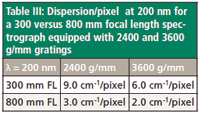 Table III: Dispersion/pixel at 200 nm for a 300 versus 800 mm focal length spectrograph equipped with 2400 and 3600 g/mm gratings