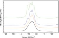 Figure 3: 155 cm-1 line of crystalline sulfur recorded with instruments whose focal length varied between 1920, 640, 460, and 250 mm (from top to bottom). (Courtesy of Sergey Mamedov of Horiba Scientific.)