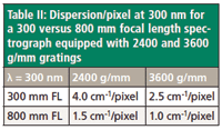 Table II: Dispersion/pixel at 300 nm for a 300 versus 800 mm focal length spectrograph equipped with 2400 and 3600 g/mm gratings