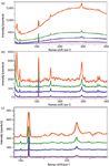 Figure 8: Raman spectra of slightly fluorescent paper recorded with 532-nm laser on the Aramis (460 mm focal length), using 300-, 600-, 1200-, and 1800-g/mm gratings, adjusting the integration times to scale with the groove density (1, 2, 4, and 6 s). Top, as recorded; middle, after baseline subtraction, with vertical displacement for clarity; bottom, after baseline subtraction, expanded region.