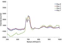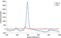 The Raman spectra measured with the modular Raman system using traditional Raman sampling for melamine on a silver substrate are shown in Figure 1. Note the characteristic peak for melamine near 700 cm-1 in the spectrum measured just after the substrate was printed (day 0). Deterioration of the silver substrate is observed by the loss of this peak in the Raman spectrum measured 24 h after the substrate was printed (day 1). The silver substrate degraded significantly within 24 h of printing, resulting in an inability to detect melamine with this aged substrate.