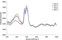 The improvement in the SERS measurements for melamine is even better when the excellent stability of the gold substrates is combined with the ROS sampling technique. When the relative intensity of the Raman peaks for melamine in Figure 2 is compared to the relative intensity of the melamine peaks in Figure 3, the signal measured with ROS sampling (Figure 3) is almost two times the relative intensity of the signal measured with traditional Raman sampling (Figure 2). This increase in Raman intensity measured using ROS sampling clearly demonstrates the dramatic improvement in sensitivity achieved with ROS when a larger area of the SERS substrate is sampled. By sampling a larger surface area, more Raman hotspots are measured leading to improved sensitivity and the possibility to detect even lower concentrations of melamine or other food contaminants and additives.
