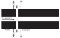 A Brubaker prefilter (10) (Figure 2) consists of a set of four short, cylindrical electrodes (sometimes called stubbies) mounted colinearly and in front of the main quadrupole electrodes. Without the prefilter, ions from the source may not enter the quadrupole because of fringing fields at the front end, which are created by the exposed ends of the rods themselves. Transmission decreases because of this front-end loss. The Brubaker prefilter is driven with the same AC voltage (that is, the radio frequency voltage) applied to the main rods, and acts to guide ions in to the main quadrupole. It is an "rf-only" quadrupole that was later used in triple-quadrupole MS-MS instruments. The dynamics of these devices have been widely studied (11,12) and they serve several functions in the triple quadrupole instrument, depending on the pressure within the device. With the use of a Brubaker prefilter in a single-quadrupole instrument, the transmission of ions is greatly increased, although the increase is known to be mass-dependent. These devices are almost universally designed into quadrupoles. It is interesting that Brubaker's invention of the prefilter was a consequence of his need to maintain ion transmission in very small quadrupoles, such as what might be carried aboard the probes into the upper atmosphere or in spacecrafts. Transmission losses because of fringing fields are especially severe in these small devices. Nowadays, quadrupole mass filters can be microfabricated, with the prefilter and filter assembly only 3.2 cm in length. Wright and colleagues describe the incorporation of the Brubaker prefilter in miniature quadrupole mass filters (13).