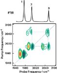 As an example, consider the FT-IR spectrum shown in Figure 1, which is collected for a dilute mixture of two molecules. The FT-IR spectrum contains three absorption bands. We know from the frequency range that these bands must correspond to functional groups with triple-bond character, but which functional group belongs to which molecule? The measured 2D IR spectrum for the same mixture is also shown. Notice that each of the absorption bands in the FT-IR spectrum produces a pair of peaks along the diagonal in the 2D IR spectrum. A diagonal slice along a 2D IR spectrum contains essentially the same information as an FT-IR spectrum. In addition, there are pairs of cross peaks between peaks 2 and 3, but not between peaks 1 and 2 or between 1 and 3. Thus, peaks 2 and 3 are vibrationally coupled, but neither is coupled to peak 1. Therefore, from the peak pattern we can quickly and confidently assign peak 1 to one molecule and peaks 2 and 3 to the other. In fact, the solution is a mixture of W(CO)6 (peak 1) with a rhodium metal dicarbonyl (peaks 2 and 3). The peaks in the rhodium dicarbonyl exhibit very strong cross peaks because they share a common metal atom, but do not couple to the modes of W(CO)6 because the two molecules do not bind to one another. Thus, the cross peaks show us connectivity between absorption bands, and this information in turn teaches us about structure. Of course, mixtures like this can be disentangled using just FT-IR spectroscopy, such as by peak fitting with a spectral library or changing the concentration. But in many cases, the additional information from 2D IR spectra provides information not easily obtainable by other means. I give a few examples below in answers to other questions.