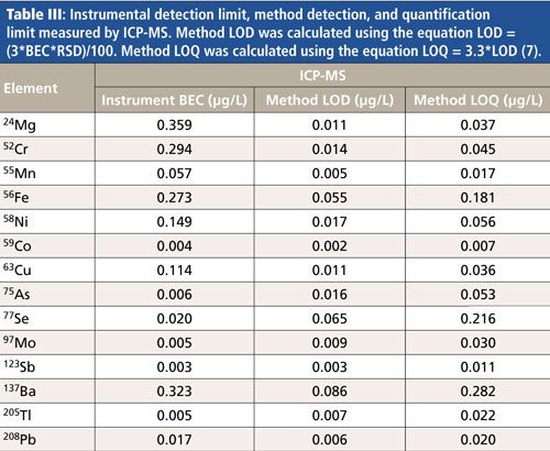 Table III presents the instrumental background equivalent concentration (BEC), method limit of detection (LOD), and method limit of quantification (LOQ) for all 14 elements in this study. BEC was measured directly by ICP-MS during the run, method LOD was calculated as 3.3 times the standard deviation of triplicate analyses of the calibration blank, and the method LOQ was calculated as 10 times the standard deviation of the triplicate analyses of the calibration blank (7). To summarize, the instrument BEC for all elements was within the range of 0.006–0.359 μg/L, and the method LOD was demonstrated to be in the range between 0.002–0.086 μg/L.