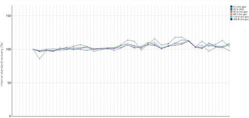 Figure 1: Internal standard recovery percentage measured with ICP-MS. All five internal standards in no gas mode (6Li, 45Sc, 89Y, 115In, 209Bi) have a recovery (%) range of 96–113%. Internal standard (45Sc) in He mode has a recovery (%) range of 86–118%.