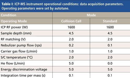 The entire study was performed using an Agilent 7700 quadrupole ICP-MS system (Agilent Technologies). The instrument parameters are summarized in Table I. The 14 elements were analyzed using ICP-MS in two separate modes. Most of the elements of interest were analyzed using standard mode. However, for Fe analysis, He mode with a collision cell was used to eliminate intense plasma- and polyatomic-based interferences such as 40Ar16O+.