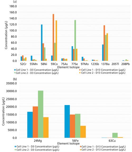 The analytical approach used for this experiment was validated by performing an accuracy check and a precision spike study. The method was then performed to assay a wide range of concentrations of the following elements of interest: Mg, Cr, Mn, Fe, Co, Ni, Cu, As, Se, Mo, Sb, Ba, Tl, and Pb. These elements originated from two common industrial cell lines, designated in this study as cell line 1 and cell line 2.