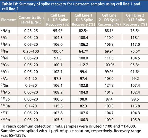 Table IV summarizes the results of all spike recoveries (%). The spike recovery values were within the range of 65–125%, indicating the capability of this method to recover successfully in the presence of matrix. Based on specific concentration levels in cell culture media, some abundant elements such as 24Mg and 56Fe were analyzed using a 1:4000 dilution. Elements such as Co and Cu were analyzed by larger dilutions within cell line 2 samples and smaller dilutions in cell line 1 samples.