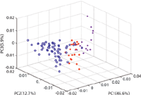 Figure 4: PCA scores plot of the MSC-D1 treated FT-IR spectra of authentic (blue), illicit (magenta), and counterfeit (red) tobacco products measured using a portable FT-IR instrument equipped with an ATR sample interface.