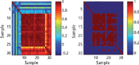 Figure 3: Correlation map of the MSC-D1 FT-IR spectra of pure substances: (1) ammonium hydroxide, (2) formic acid, (3) glucose, (4) resorcinol, (5) rutin, (6) sucrose, (7) nicotine, (8â22) authentic tobacco, (23â26) illicit tobacco, and (27â31) counterfeit tobacco measured using a portable FT-IR instrument equipped with an ATR sample interface.