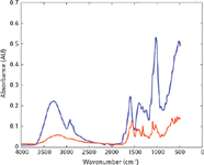 Figure 2: ATR-FT-IR spectra of authentic (blue) and counterfeit (red) tobacco products measured using an FT-IR portable instrument.