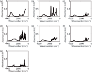 Figure 1: ATR-FT-IR spectra of (a) ammonium hydroxide, (b) formic acid, (c) glucose, (d) resorcinol, (e) rutin, (f) sucrose, and (g) nicotine measured using a portable FT-IR instrument.