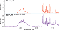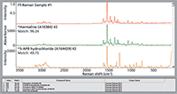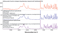 Figure 5 shows an infrared spectrum acquired with a handheld instrument (Thermo Scientific TruDefender) from a white powder discovered at a clandestine laboratory. The results of searching off-line the external ATR reference library produced a best match to 3-methylmethcathinone (3-MMC) hydrochloride with a value of 93. The result: A very good match was obtained for a spectrum acquired in the field from a sample of questionable purity under less than ideal conditions (7,8).