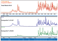 Figure 6 shows the MCS results (using Thermo Scientific OMNIC Specta software) for the sample. The automated selection of two components from the ATR library results in a high similarity of the composite spectrum to the sample spectrum. Results similar to this enable FT-IR-MCS to become a first screen when materials arrive, being far quicker than most alternatives.
