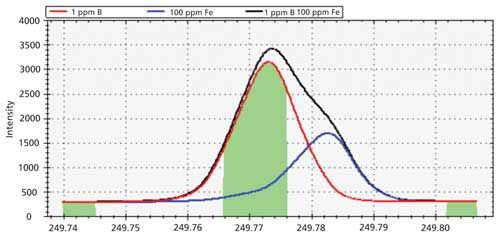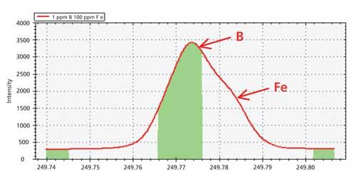 A shoulder is clearly visible on the right side of the main peak, indicating the presence of a spectral overlap on B at 249.773 nm. If the emission profile for the sample solution is overlaid with that of single-element solutions containing 1 ppm B and 100 ppm Fe, the image in Figure 5 is produced.