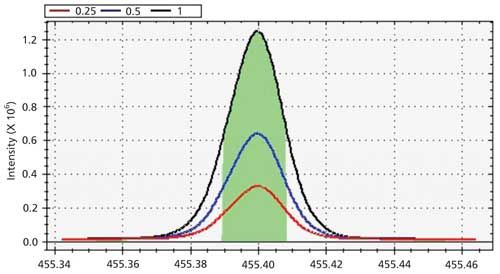 In this figure, the red peak represents the emission profile for 1 ppm B at 249.773 nm, whereas the blue trace represents the emission peak for 100 ppm Fe at 249.782 nm. The black outline represents the combined emission from a sample containing 1 ppm B and 100 ppm Fe. The center green-shaded region represents the area under the peak that will be used for data collection. This area includes a portion of the emission peak from Fe and, if left uncorrected, this analytical measurement might produce erroneous data.