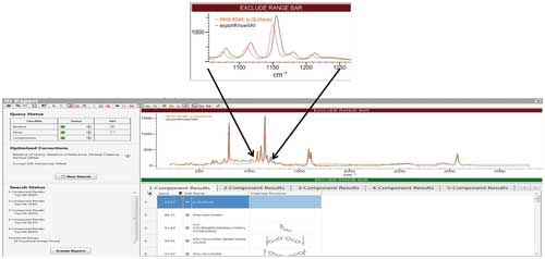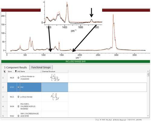 The second hit in the database is for pure polyvinyl chloride (PVC), with a hit quality index of 97.97, not much different from the first with a score of 98.28. The scores are negligibly different, but inspection of the spectra at the top of Figure 2 indicates the absence of a small carbonyl band near 1737 cm-1 in the database spectrum of the second hit. That means that the KnowItAll software and database was sensitive enough to find the copolymer with the acetate carbonyl even though the difference in the scores for the copolymer and polymer was quite small. What KnowItAll does not tell us is the percent composition of the copolymer. To extract that information, the database would have to include multiple samples of the copolymer, made with different compositions, on which the unknown could be searched.