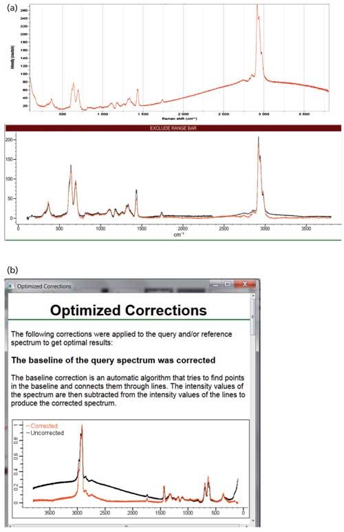 Figure 1: (a) Spectrum of unknown, as recorded in LabSpec (top) and then imported into KnowItAll, and baseline-corrected (bottom). (b) Message in KnowItAll, informing the user of the baseline correction that was done in the background.