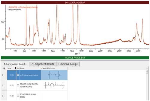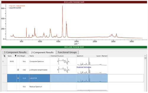 Figure 6: Top result of a two-component search identifying the presence of polyethylene terephthalate and polybutylene terephthalate with contributions to the spectrum of 0.82 and 0.18.